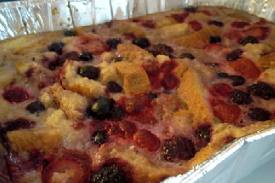 Prep Day: Trim crusts off the bread and cut into cubes. Cut cream cheese into 1/2 inch cubes. Spray a 13×9 inch baking pan with non stick baking spray. Arrange 1/2 of bread cubes in the bottom of the pan. Top with 1/2 of the cream cheese cubes, mixing the layers somewhat (you do not want smooth layers). Mix all berries together and pour on top. Top with remaining cream cheese and then ending with remaining bread cubes. In large bowl beat together remaining ingredients. Pour entire mixture on top. Wrap and freeze.