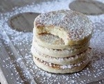 The ingredients are similar to scone ingredients, but the dough is possibly a little bit sweeter (although that could have been all the powdered sugar I sprinkled on top!) The dough is easy to work with and it only took about 15 mintues to throw these together. They cook quickly on the stove and are just perfect served hot off the griddle. The insides of these flat little cakes are light and fluffy with a texture similar to a biscuit or scone. The original recipe calls for a sprinkling of raw crunchy sugar on top, which would add a wonderful crunch!
