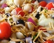 Prep Day: Cook pasta according to package directions in salted boiling water. Drain and rinse with cold water. Add other ingredients, dressing last. Add enough dressing to fit your taste. Chill until serving.