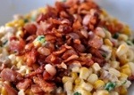 Prep Day: In the reserved bacon grease, saute corn, onion, and peppers in a large skillet over medium heat until peppers are tender. Add all remaining ingredients (except bacon), stirring until cream cheese is melted and well-incorporated. Pour into a 13×9 casserole dish, and top with the crumbled bacon.