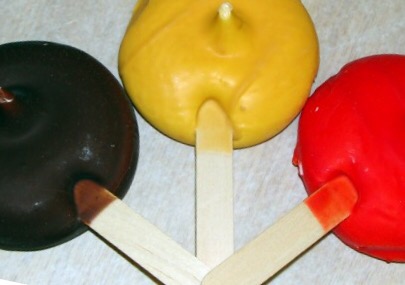 The amount of baking chips you need depends on size & quantity you are making. Separate chips into bowls. Melt chips, by putting them in a microwave for 30 seconds, stir, repeat until smooth.