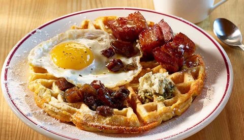 Asparagus, Cheddar and Quinoa Savory Waffle with a Fried Egg, Lemon Pepita Butter, Rhubarb Jalapeño Marmalade, & Bacon Lardons