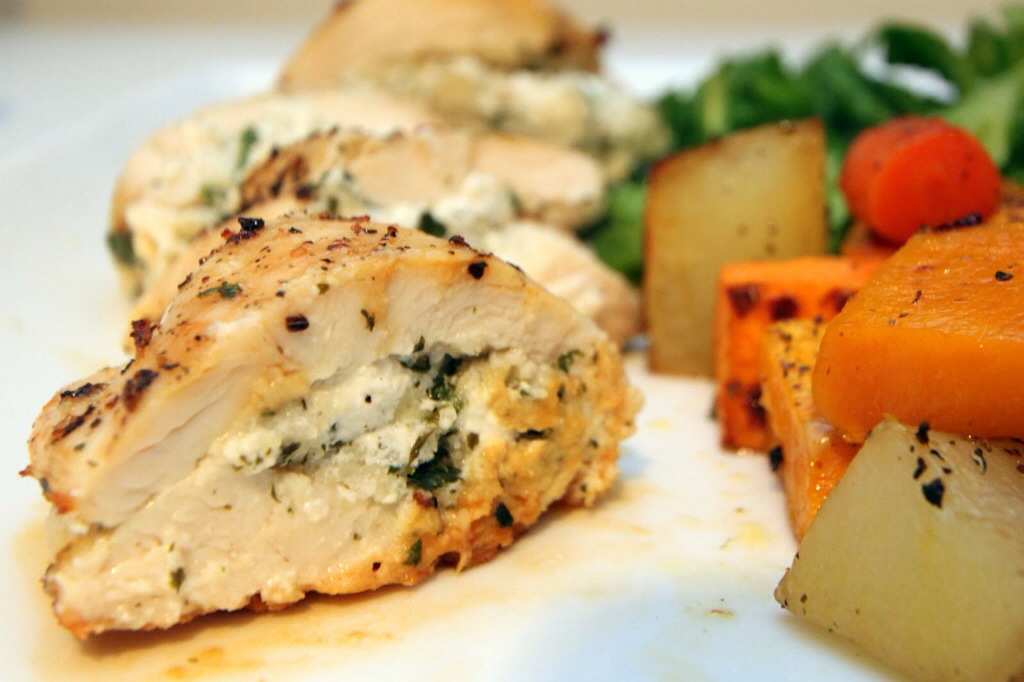 Prep Day Directions: Prepare Stuffed Breasts: With tip of knife, cut each chicken breast from a long side, keeping knife parallel to surface of breast, to form a deep pocket with as small an opening as possible. In small bowl, combine cheese, peppers, and basil. Spread 1/6 cheese mixture in each chicken pocket. Rub outside of chicken with oil and sprinkle with salt and pepper. Either flash freeze or grill.