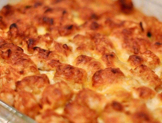 With a large scooper, fill each tortilla with mixture. Roll it up and place it in large 9×13 baking dish with seams down. Repeat until all chicken mixture is used.