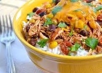 Serve Day: Put chicken mixture and 1/4 cup water into slow cooker. Cook on low for 8 hrs. Near the end of cooking time, cook the two cups of rice. Simmer in 5 cups water for 15 min. Let stand for 5 min. Fluff with fork. If cooking one cup at a time, use 2-1/2 cups water. After 8 hours of cooking, stir with a fork to shred chicken. Build taco bowls by placing rice on the bottom, then the taco chicken mix, shredded cheese and fresh cilantro.
